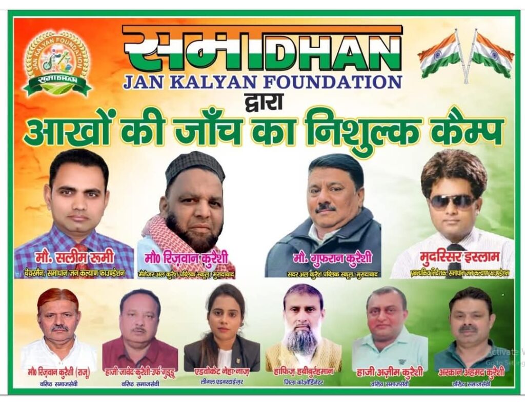 *अलकुरेश पब्लिक स्कूल* बड़ा हाते के सामने असlलतपुरा मुरादाबाद में दिनांक 11 जनवरी 2025 बरोज शनिवार को समाधान जन कल्याण फाउंडेशन एवं सी एल गुप्ता आई इंस्टीट्यूट की ओर से एक कैंप लगेगा। जिसमें आंखों की जांच निशुल्क की जाएगी। और गरीब लोगों के आंखों के मोतियाबिंद के ऑपरेशन निशुल्क किए जाएंगे एवं चश्मे पर भी 20% की छूट मिलेगी।
