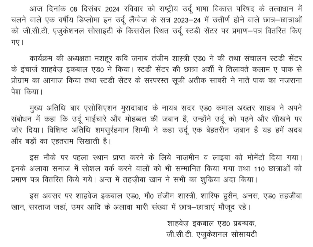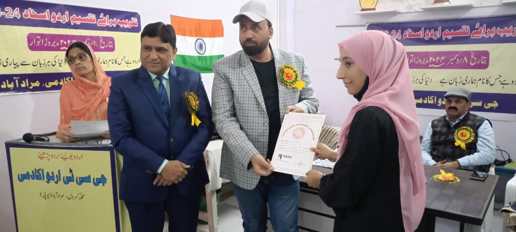 GCT एजुकेशनल सोसाइटी द्वारा एक वर्षीय उर्दू भाषा में सक्सेस होने वाले छात्रों को प्रमाण पत्र वितरित