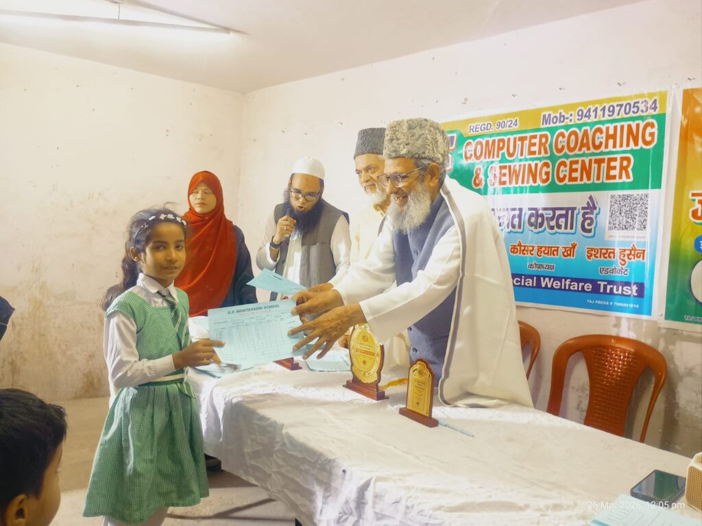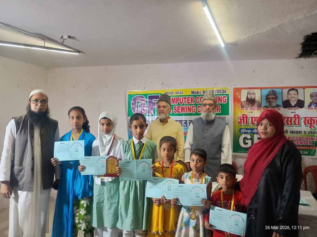 आज जी एफ मोंटेसरी स्कूल मे बच्चों को रिपोर्ट कार्ड बाटे गए जिसका आगाज़ हाफ़िज़ सय्यद अबू बक्र ने क़ुरान की तिलावत से शुरू करा जिन को पाकर बच्चों के चेरे खुशी से झूम उठे स्कूल मे कक्षा 2 की ज़र्का ने स्कूल मे सबसे ज़्यादा नंबर लाकर टॉप करा कक्षा 1 मे आफिया.प्रथम आलिमा.द्वितीय और तृतीय स्थान माहि नूर रही कक्षा U. K. G मे भी बच्चों ने काफ़ी मेहनत करके कामयाबी हासिल करी एस एम ग़ालिब अली ने कहा सभी बच्चों ने बड़ी मेहनत करी मे सभी बच्चों को पास होने पर उनको मुबारक बाद देता हूं स्कूल के मैनेजर कौसर हयात खान साहब ने भी बच्चों को तालीम की एहमयत बताई l
