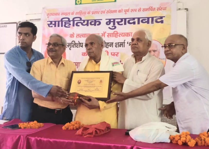 मुरादाबाद। मुरादाबाद मंडल के साहित्य के प्रसार एवं संरक्षण को पूर्ण रूप से समर्पित संस्था साहित्यिक मुरादाबाद की ओर से साहित्यकार राजेन्द्र मोहन शर्मा श्रृंग की जयंती पर सम्मान समारोह एवं संगोष्ठी का आयोजन किया गया जिसमें हिन्दी साहित्य के प्रति समर्पण एवं सक्रियता के लिए वयोवृद्ध साहित्यकार रामदत्त द्विवेदी को अंगवस्त्र, मानपत्र, श्रीफल भेंट कर राजेन्द्र मोहन शर्मा श्रृंग स्मृति सम्मान से सम्मानित किया गया। इस अवसर पर अखिल भारतीय साहित्य कला मंच ,वर्णन प्रकाशन, हेमा तिवारी भट्ट और मनोज मनु द्वारा भी उन्हें सम्मानित किया गया।