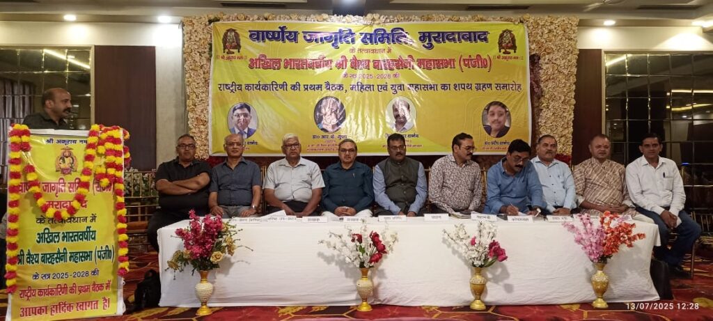 वार्ष्णेय जागृति समिति मुरादाबाद के तत्वाधान में अखिल भारतवर्षीय श्री वैश्य बारहसैनी महासभा के सत्र 2025-2028 की राष्ट्रीय कार्यकारिणी की प्रथम बैठक दिनांक 13 जुलाई, 2025 को मुरादाबाद में आयोजित